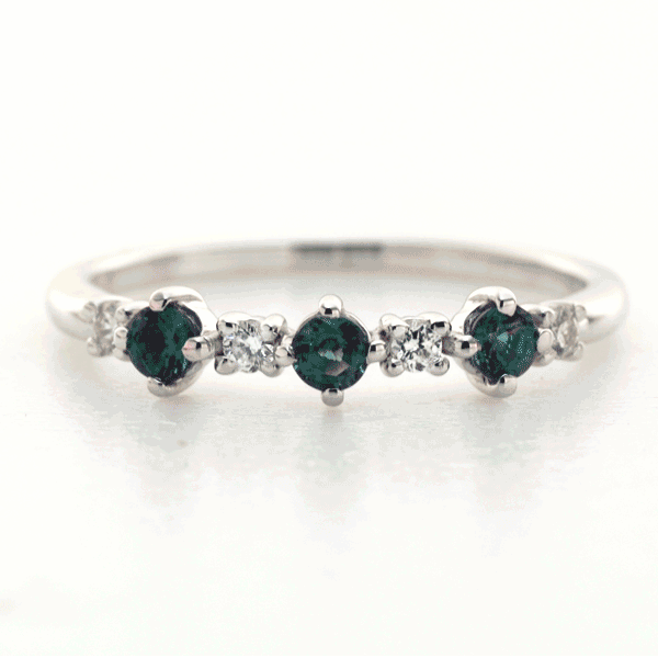 《スペック》 ■本体素材: K18ホワイトゴールド(サンプル) アレキサンドライト(約)2.4mm×3石 ダイヤモンド(約)1.7mm×4石 (約)0.08ct ■サイズ: 内径(約):16.3mm 幅(約):1.2-3.5mm 厚(約):1.0-2.8mm 重量:(約)1.76g ※表記はすべて石枠込みとなっております。
