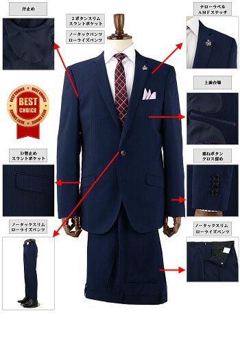 【仕様】 2ボタンスリムスーツ ノータックローライズスラックス センターベント AMFステッチ 背抜き仕様 スラントポケット 【品質】 68-20 表地 ポリエステル70% 毛30% 07-32、07-33 表地 毛49% ポリエステル41% レーヨン10% 31-20、31-21 表地 ポリエステル51% 毛49% 裏地 ポリエステル 【表地 色柄特徴】 68-20 黒 シャドーストライプ(Bスト) 07-32 ブルー グレンチェック(格子)(BL格子) 07-33 グレー グレンチェック(格子)(LG格子) 31-20 黒 ストライプ(Bスト) 31-21 紺 ストライプ(NVスト) 【着用期間】 3月〜10月(東京基準) 【生産地】 中国製 【表地目付け】 68-20 250g/1m*153cm(概算値) 07-32,07-33,31-20,31-21 220g/1m*153cm(概算値) gの値が小さくなれば肉薄になります。