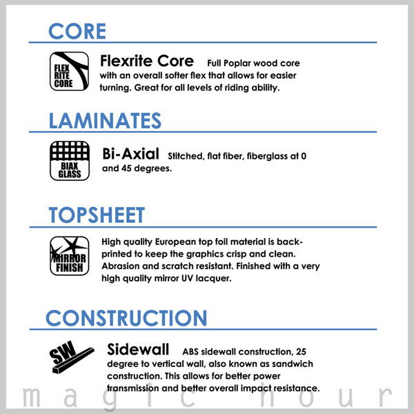 キャンバーとロッカーを融合させたハイブリッド構造だから、フリーランでの回転性もよくトリックも仕掛けやすい! グラスファイバーを配合することで程よい反発を得られ、オーリーやジャンプも楽しい板に仕上がっています。