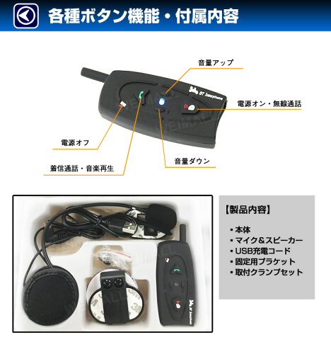 マウンテンバイク、ロードバイク、登山、スキー、スノーボード、などアウトドアスポーツでも大活躍です! 商品仕様 最大500m通話可能 最高120キロ走行での通話可能 ノイズキャンセラー搭載 防水・全天候設計 フル充電で最大7時間通話 Bluetooth対応 携帯電話からの着信可能 USB接続での充電 商品内容 本体 ×2 マイク&スピーカー ×2 USBケーブル ×2 固定用ブラケット ×2 英語版取扱説明書 ×2 注意事項 ・完全防水ではありませんので、水に浸けないようご注意ください。